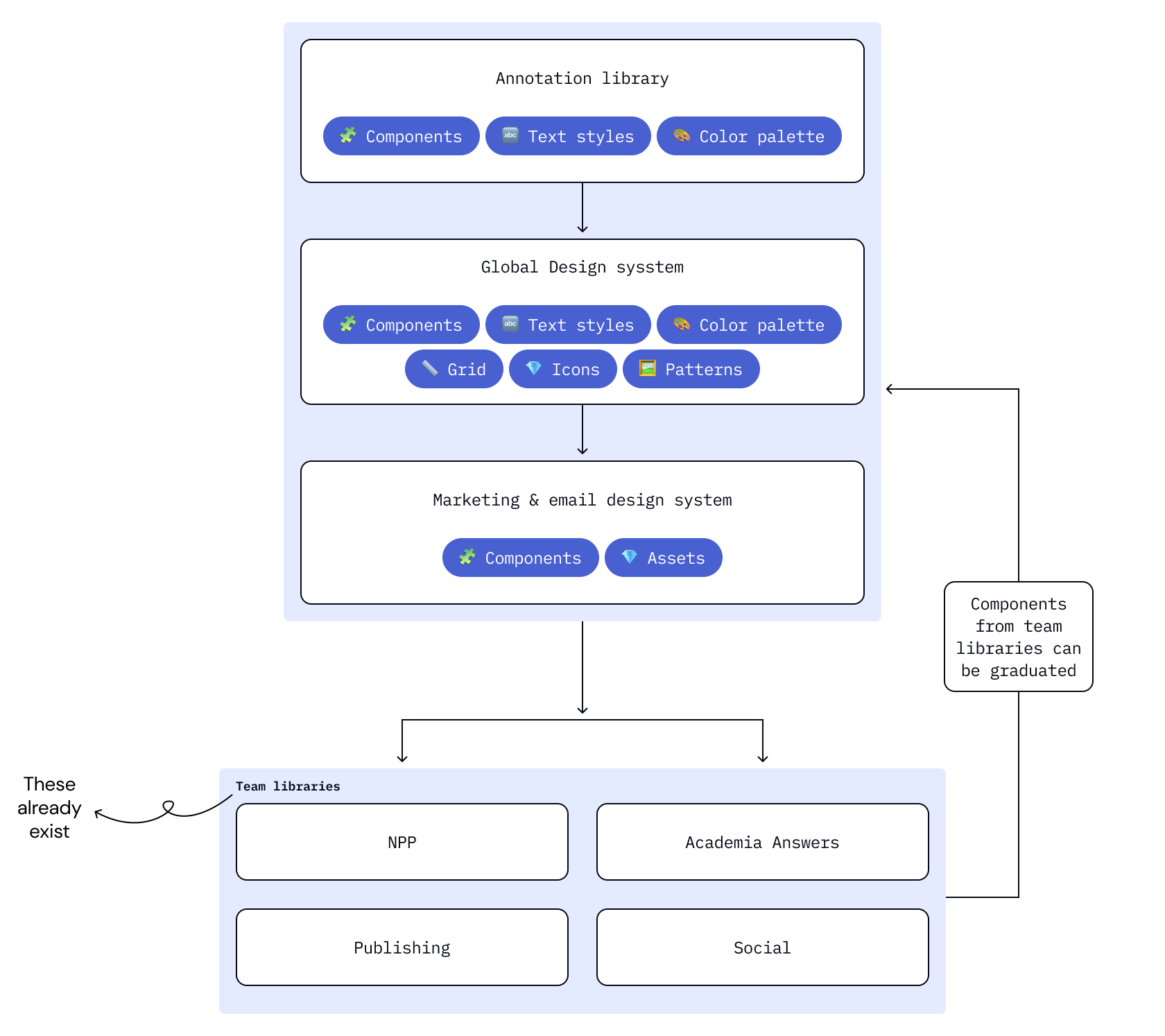 When a component’s use expands beyond that of a single product, it gets “graduated” to the global design system.