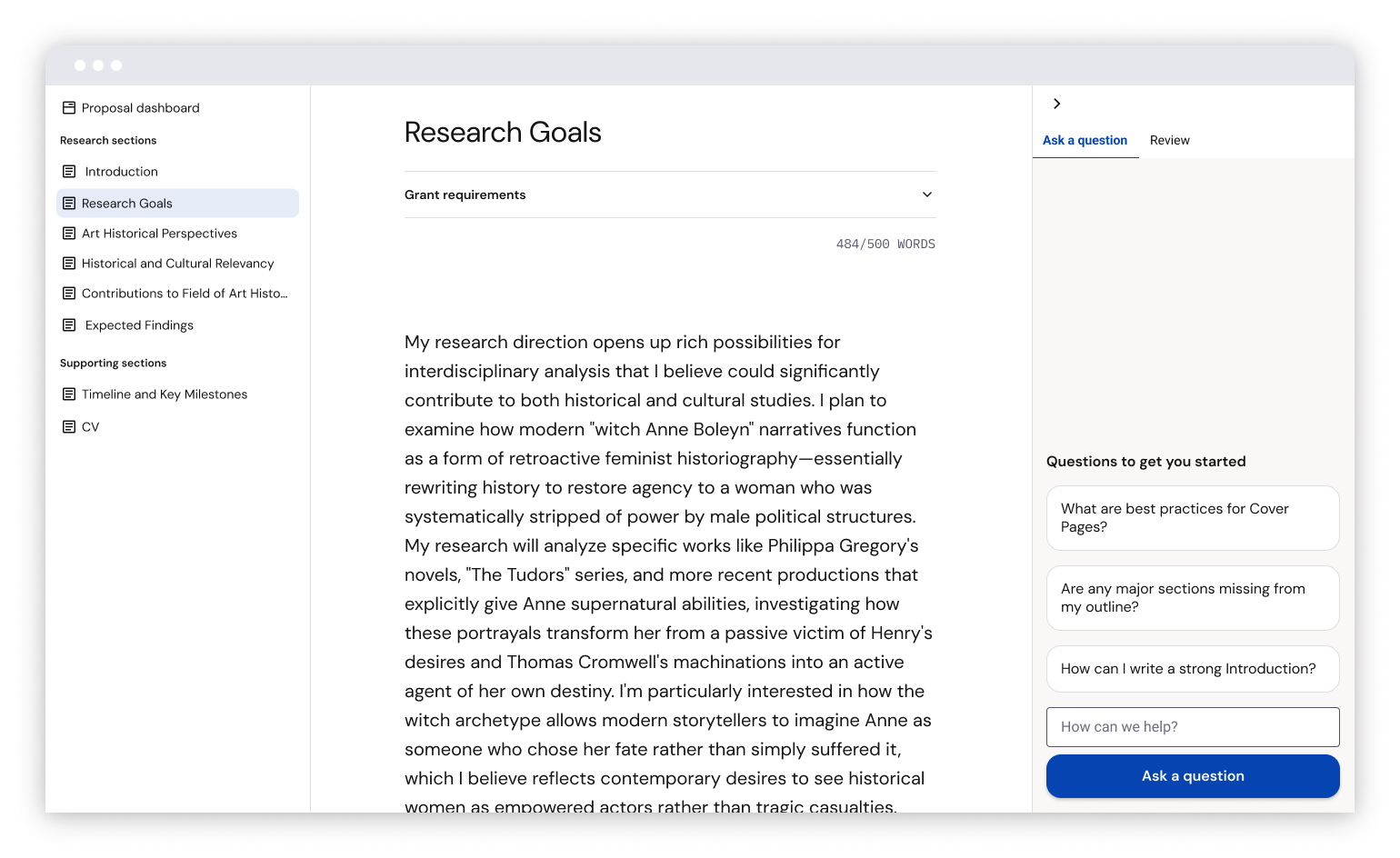 The Grants tool has expertise about what is required by major funders and understands the requirements for each funding opportunity. Funders can have specific section requirements, word count limits, and formatting requirements.