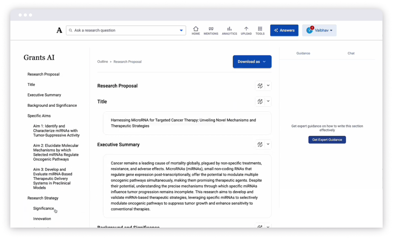 Based on the grant’s requirements, we generate an outline with all the sections required for submission.