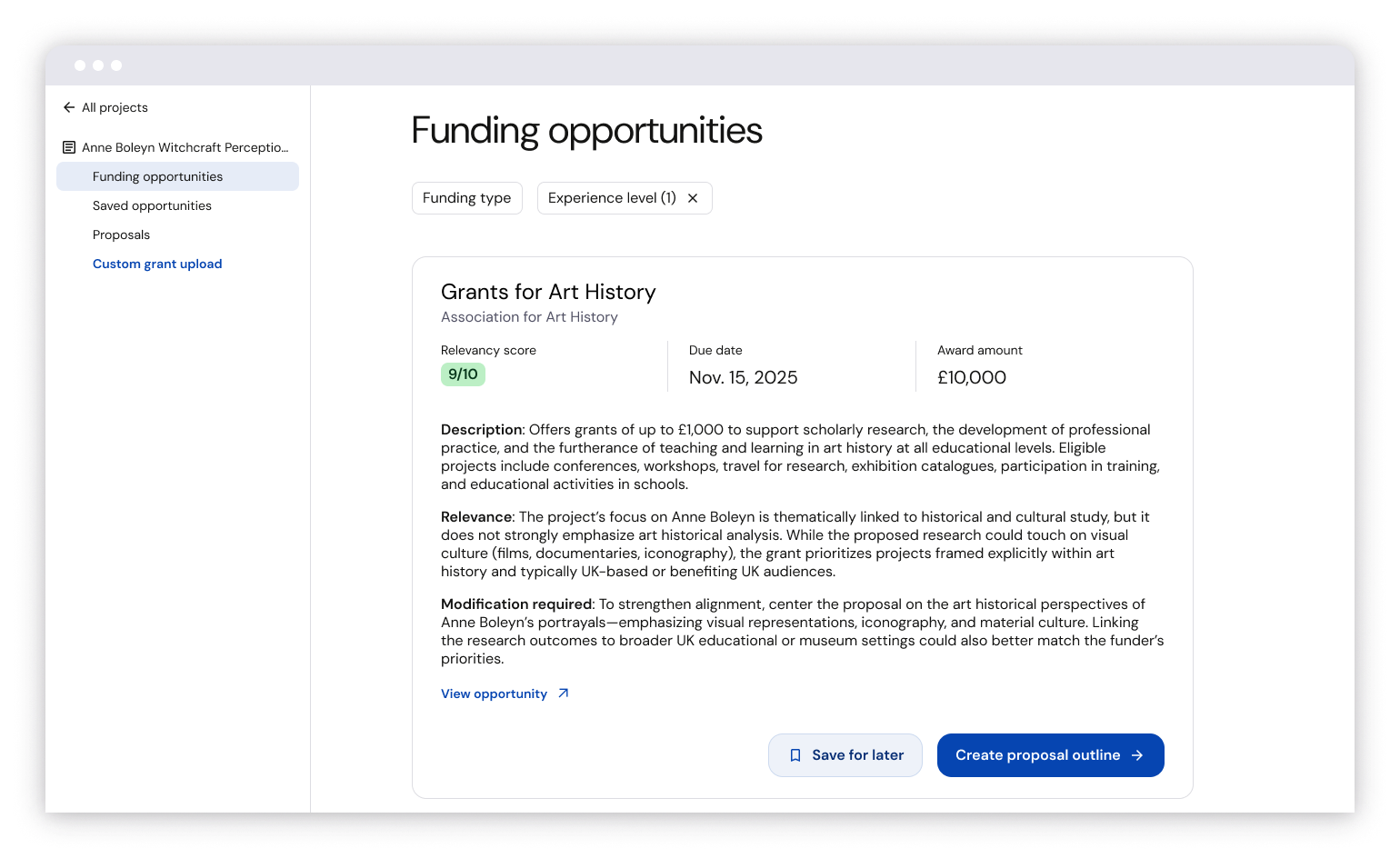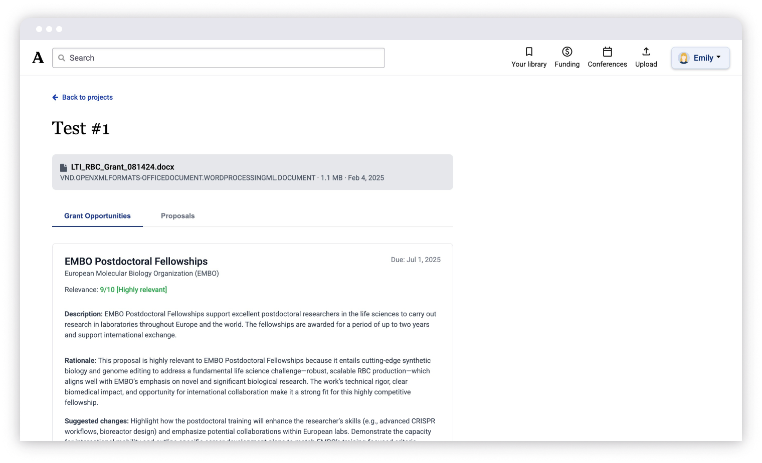 Users upload a previous research proposal and it is used as the basis for finding new funding opportunities.