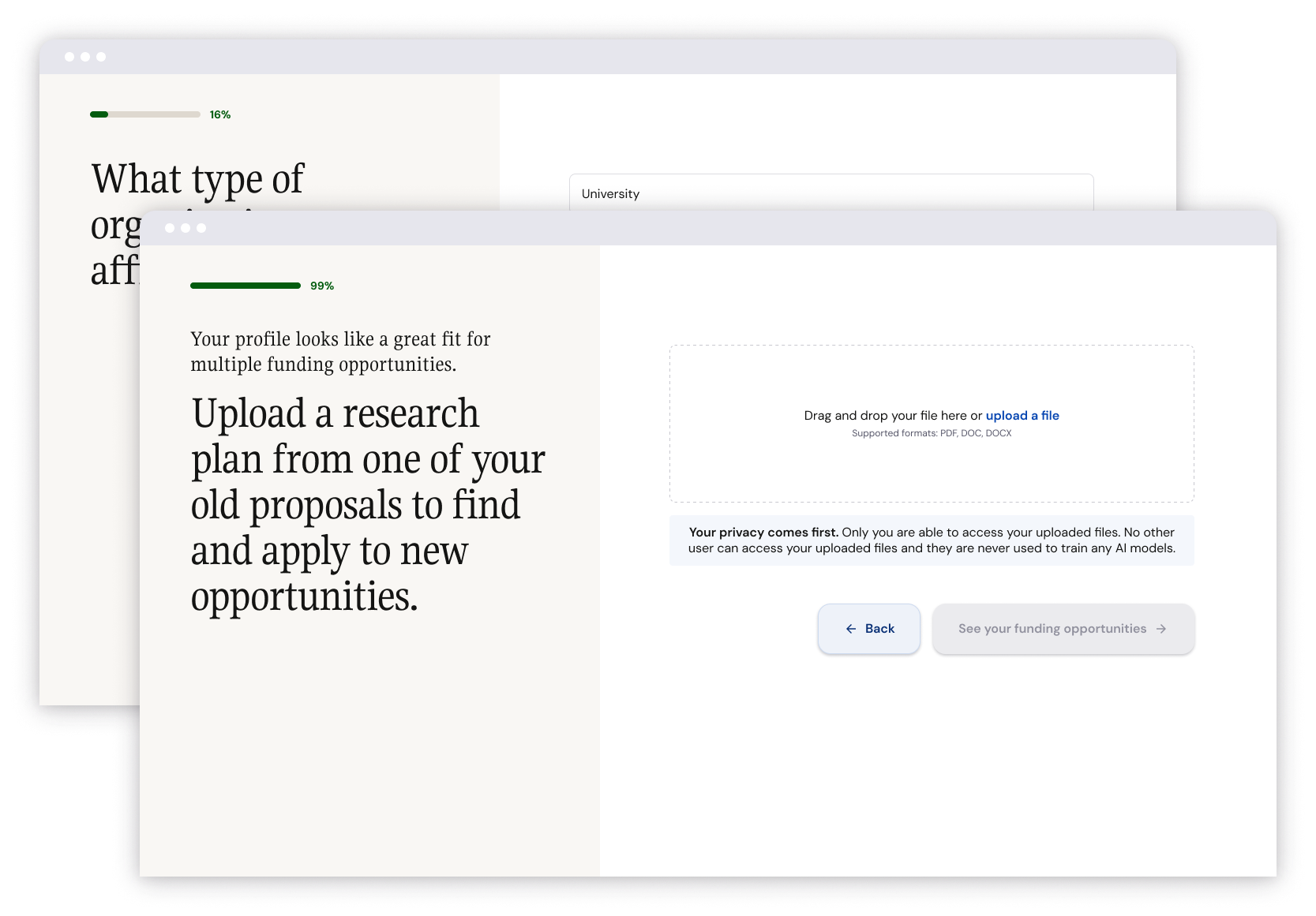 The experience starts with an onboarding question flow. Users are asked basic questions about their role, experience level, and research. Some of these questions are for our own edification, and some are used when we search for matches. Most importantly, the flow ends at an upload page where users provide a past research proposal. This proposal is the basis for the entire experience.