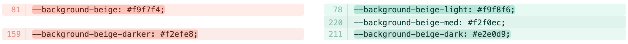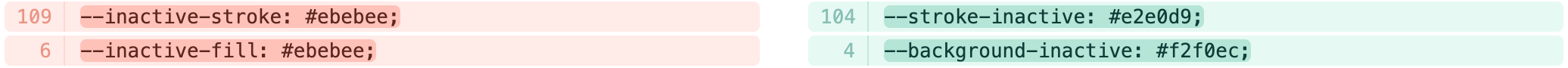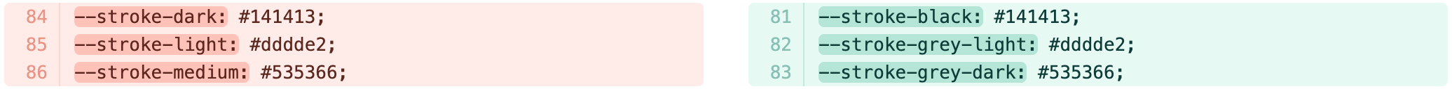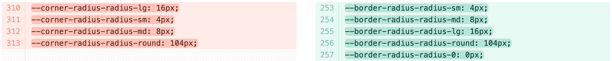 After over a year of regular use, I had made changes to support designer ease-of-use. This included tweaks to token names for better discoverability and adjustments to token values to better align with design decisions.